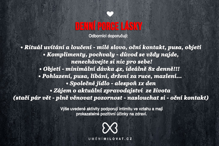 Každý preferuje ze široké dotekové škály něco trochu jiného. Žijete-li s někým ve vztahu a milujete ho, měli byste vědět nebo zjistit, co má v tomto ohledu rád nebo ráda. Zkoušejte, ptejte se. A žádejte. Jestliže váš milovaný parťák není přirozeně dotykový typ, řekněte si o dotykové projevy lásky sami a naučte ho, jak se má on nebo ona dotýkat vás. "Já bych potřebovala obejmout, dej mi ruku, dej mi pusu, brouku, škrábej mě chvíli na zádech, prosím...". Zbavte se mylných představ, že o projevy lásky si člověk říkat nemá. Naopak. O konkrétní projevy lásky, po kterých toužíte, si říci MUSÍTE. Někdo možná to štěstí má, nicméně obecně vycházejme z předpokladu, že nežijete s jasnovidcem. Tím, že jasně vyjadřujete své potřeby, dáváte dohromady takový manuál společné lásky - navzájem se učíte, jak si nejlépe vyjít vstříc a potěšit se. A ten se bude hodit za různých okolností, v dobách krizí a nepokojů pak zejména.